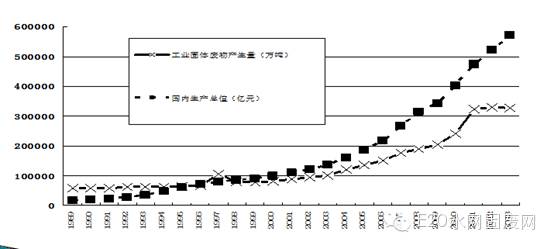 工业固废的产生和经济的增长几乎是同步增长的。因为不同的数据来源,其实前后的数据是矛盾的,但是这个趋势却是非常的贴切。