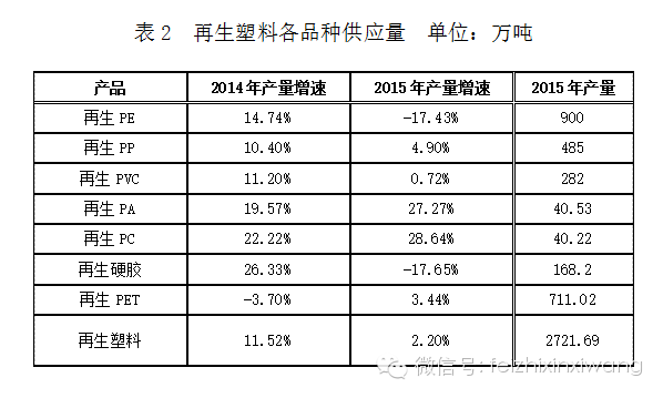 2015年再生塑料供应量明显放缓(见表2)。在统计的7个再生品种中,供应量萎缩的产品有2个,其中以再生PE为代表,供应量减少150万吨;再生硬胶也减少30万吨,降幅达到17.65%。其他再生料供应增速都有所减少,几乎与2014年供应量持平。据调研,2015年再生塑料的整体供应量达到2721万吨,其中再生通用料的供应量达到1900万吨,较2014年减少近160万吨。目前再生塑料行业面临环保压力,各省市正在严抓环境质量,另外由于国际经济形式不容乐观,预计2016年再生通用料的供应量将继续减少。