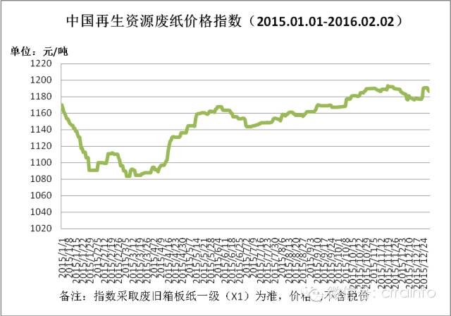2015年,废纸市场国废价格整体呈现先跌后涨的趋势,中国再生资源废纸价格指数1月份是 1189元/吨,12月份为1183元/吨,废纸价格经过一年的震荡变化,与年初基本持平。