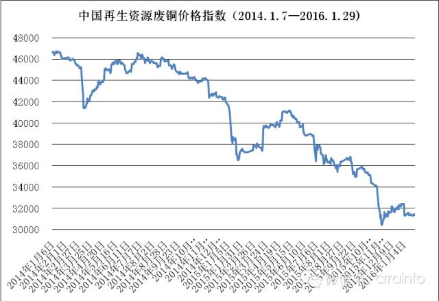 中国再生资源废铜价格指数1月份是42359元/吨,年底下降至32336元/吨,全年废铜价格指数下跌10023元左右,跌幅23.7%。