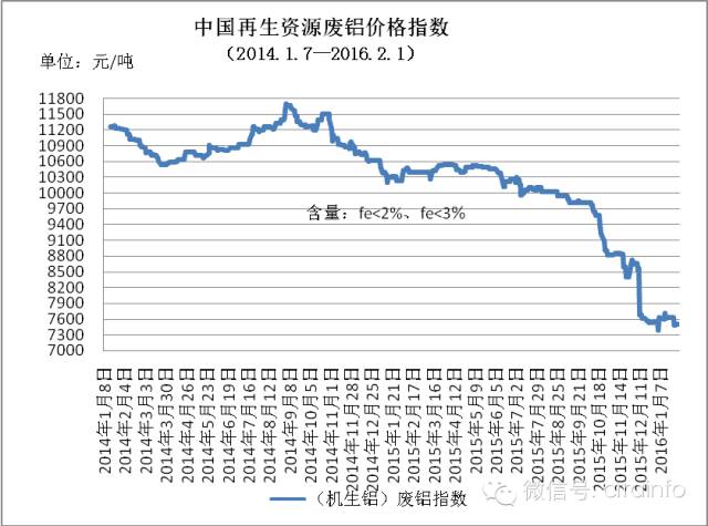 中国再生资源废铝价格指数1月份是10615元/吨,年底下降至7541元/吨,全年废铝价格指数下跌3074元左右,跌幅29%。