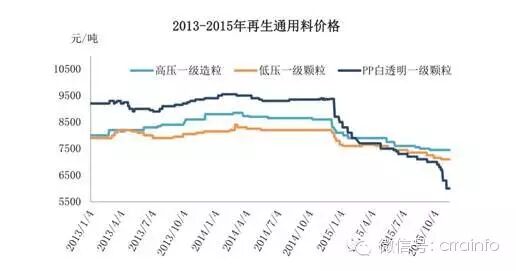 2013 年至今,再生塑料综合价格一路下滑,其中 2015 年下行幅度最大。今年国内外经济形势疲弱前行,需求持续拖累市场;加之原油低位震荡,PE 新料报盘一度走低,在多重利空情况下,2015 年再生塑料市场整体凸显 “需求疲软,报盘震荡下行”的特点。