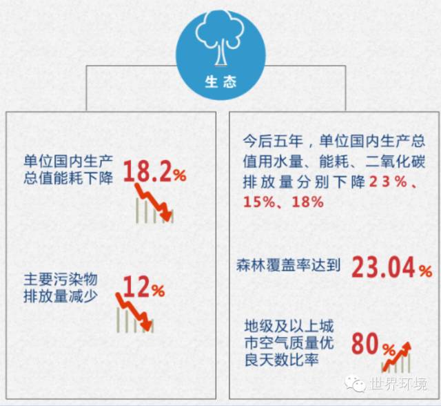 他说,今后五年,单位国内生产总值用水量、能耗、二氧化碳排放量分别下降23%、15%、18%,森林覆盖率达到23.04%, 能源资源开发利用效率大幅提高,生态环境质量总体改善。特别是治理大气雾霾取得明显进展,地级及以上城市空气质量优良天数比率超过80%。“我们要持之以恒,建设天蓝、地绿、水清的美丽中国。”