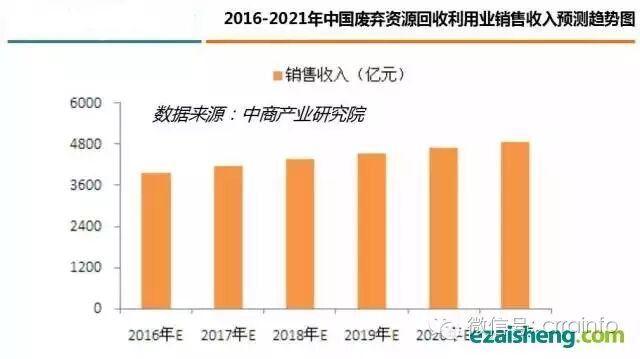 工业化、城镇化、农业现代化加速发展,将为经济增长提供持续动力;随着居民就业和收入继续改善,社保体系逐步健全,国内消费继续平稳增长;节约资源保护环境建设两型社会,发展循环经济将会摆在更加突出的位置,这些都将为再生资源产业发展环境的改善发挥积极作用,将更加有力推动产业平稳快速增长。中商产业研究院预计,到2021年,我国主要再生资源利用总量将达到3.25亿吨,再生资源回收价值达到9842亿元,废弃资源回收利用业销售收入将达到4850亿元。